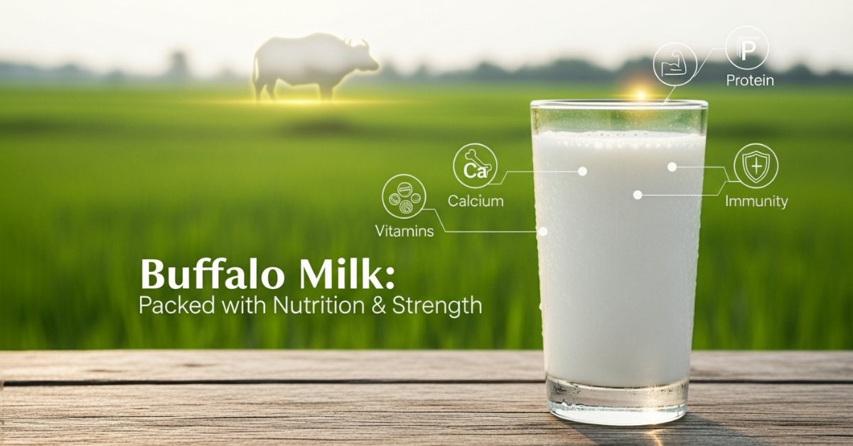 Buffalo milk is packed with essential nutrients that make it richer and more nourishing than cow’s milk. It is known for its high protein and fat content, which gives it a creamy texture and makes it more energy-dense. This is why buffalo milk is often used in making paneer, ghee, butter, and sweets it not only adds taste but also boosts nutrition.